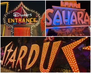 And speaking of the old days and the Sultan’s Table at the Dunes, we’ve lived in Las Vegas for just over seven years and never had been to the much acclaimed Neon Museum. We went the Friday night of Thanksgiving weekend. Honestly, we could have waited another seven years. Very disappointing. It’s the graveyard of old classic Las Vegas resort and casino neon signage. The museum is located on a dirt field, north of the Strip on Las Vegas Blvd. To say the area is seedy would be a compliment. It’s beyond that. The display area itself looks like a franchise of Sanford and Son Salvage. Behind the displays, piled high, is junk of remnant signage looking like a forgotten storage closet. Some of the lights worked, others didn’t. For a non-resident it was $35 to walk the grounds. In true Vegas fashion it was another $17 to see a half-hour video which I’m told is the best part of the exhibit. Time constraints prohibited us. The open-air two acre parcel is a non-profit venture between the city of Las Vegas and private donors. A few miles away in downtown Vegas stands the Mob Museum in a beautiful tourist friendly building exactly what the Neon Museum needs. There is so much potential for this attraction but not where it’s located today.