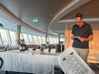 Not so much this past Friday night. The Silver Ray is a small ship, about 700 passengers and I told Andi my over/under would be 5.5 Shabbat attendees. I imagined no way would it go over. The ship had set up a room for us in the library with about 25 seats, yarmulkes, prayer books, challah and three bottles of kosher wines for the weekly blessing. Fortunately there were no spare ribs. The only thing missing was someone to lead the service.
