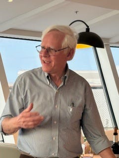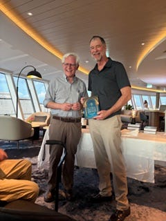 Well, Rabbi Bob Alper is indeed a retired, happy rabbi. A shipboard youngster at 80, he was a practicing rabbi for 14 years, 12 at a congregation in Philadelphia. With a doctorate in theology from Princeton, he was smart enough to have kept his mouth shut when we were looking for a volunteer to lead our prayer service.