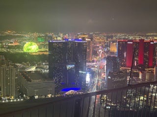 Speaking of which, back in November 16th’s Scramble we mentioned that, to my surprise anyway, the top grossing restaurant in Las Vegas is the Top of the World Steakhouse at the Strat. Never would have guessed that one. Neither did Stefanie Tuzman, the very accomplished President/CEO of the non-profit Jewish advocacy and community organization Jewish Nevada. She sent me a text and said, “I can’t believe that place is still open….let’s go!” So along with husband Jon, an exec at MGM Resorts, and Andi, we did last Saturday night. First when making the reservation you have the option of paying upfront $27 each, $108 for our party, to guarantee a window seat. That is non-refundable whether you cancel or not. The Strat is a combat zone; park and wander around the property at your own risk but go 107 floors above and it’s a game changer. Top of the Strat is a very classy, impressive venue. The seating cover charge gave us window seats 800 feet high, or 200 feet higher than the Seattle Space Needle. A great panoramic view of the entire Las Vegas Valley. The dining tier rotates, every 80 minutes it brings you back to your original view, which for us was the Sphere and Fontainebleau Hotel. Then every 15 or so minutes there is a dessert cart also on a mechanical track, that comes by with suggestions for afterwards. We actually made about a revolution and a half in a couple of hours of dining. It was fun, a lot of laughs with the ever-changing landscape view, the food was good, and the prices by Vegas standards were not unreasonable. We passed on the dessert cart; we’d seen too much of it already. I didn’t expect much going in but now, surprisingly, I’d do it again.