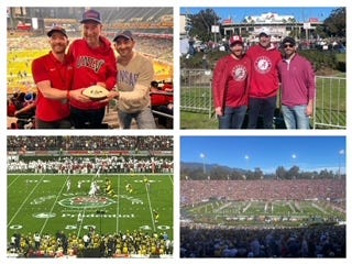 Clockwise top l-r: The boys take sides at the UNLV-Kansas game. With my UNLV shirt and KU hat, I try to walk the middle; we join together in pulling for Alabama in the Rose Bowl. Bottom: the Bama band and the glorious Pasadena setting and game action.