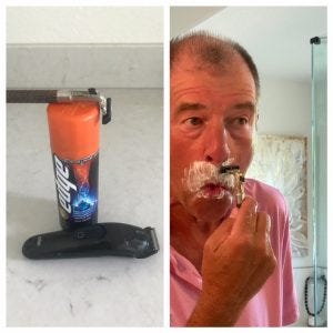 Waiting for me on the vanity was a shaver, razor and a can of Edge.