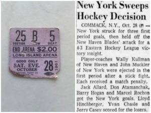 Before we melt the ice for the summer, a month ago I wrote about my hockey background and love for the game. For Father’s Day my son Jason put together a scrap book of old ticket stubs I saved from when I was a kid. My first ever hockey game was on October 28, 1961. I was nine. The Long Island Ducks played the aptly named New Haven Blades. The memory is sketchy, but I do remember sitting behind the chicken wire partition at one end of the arena. And a brawl that ensued. Now that we have the date from the ticket stub, archives proved my recollection reliable. The game was highlighted by a stick fight between the opposing coaches. Back in the day of the old minor league Eastern Hockey League, the teams had player-coaches to ease payroll. A stick fight was a duel, with the players using the blades of their sticks trying to carve their initials in the other guy’s face. Barbaric yes, but incredibly entertaining. And all for $2.00. Who wouldn’t have fallen in love with the sport?