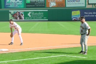 I should have gone over, introduced myself and told him what he meant to me as a kid. Instead, I was gutless. Finally on the second day, my team coached by former Pirates and Yankees manager Bill Virdon, played Maz’s team at McKechnie Field where the Pirates play their spring games. We were the home team and took the field first. I was warming up our infielders at first base, took a look over my right shoulder and here comes Maz to coach first base for the other team. Holy shit! He had a camp roster in his hand and before I could say anything to him, chomping on his trademark cigar, he said, “Hey, Alabama, what are you doing here?” Seemingly Pirates camp doesn’t have much of a following in Birmingham, Alabama, my home at the time. I guess that made me stand out. Short of bowing, I went over and shook his hand. And that started a relationship that I never would have guessed could happen. We chatted between pitches, me asking more questions than I could even think of. His ever-lit cigar blew smoke right at me. The whole situation was surreal. We blew a 6-0 lead but hung on for an 8-6 win. I also walked away with a mild case of emphysema but who cared, it was Bill Mazeroski! The win was the second most exciting thing of the day for me. I ran back to my room in the Pirates dorm to call my dad and tell him about Maz. I was eight years old again.