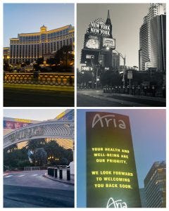 Other than maybe Disney, the Las Vegas Strip was the happiest and most congested place on earth. Today, like Disney and Broadway, it is very dark and very sad. We took a drive on Friday night, from the Sahara Hotel down Las Vegas Blvd. to the MGM Grand, and we didn’t see ten pedestrians.