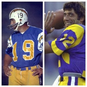 Will Brady have a more memorable end of his career as a Buc than Unitas (l) did as a Charger or Namath as a Ram?
