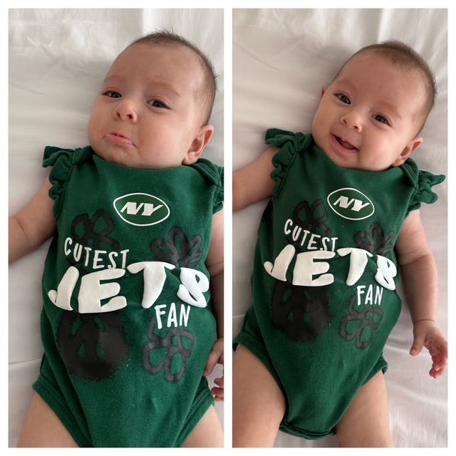 It took a little while and just as our granddaughter Harley in London was running out of patience, the J-E-T-S rewarded her with their first win of Harley’s 11-week old life. For the Jets first seven games, all losses, she gave mom and dad that now-patented Jets fan scowl. But last Sunday the magic happened. Against Cincinnati, whose defense is as porous as security at the Louvre, the Jets staged a 15 point fourth quarter comeback to break the winless schneid. The game started at 5 pm in London but as the Jets got close, Harley feigned being fussy so she could postpone crib time and watch the end. Rewarded, she and every other Jets fan had smiles all around. And today the feel good continues as the Jets can’t lose. They are on their bye week.